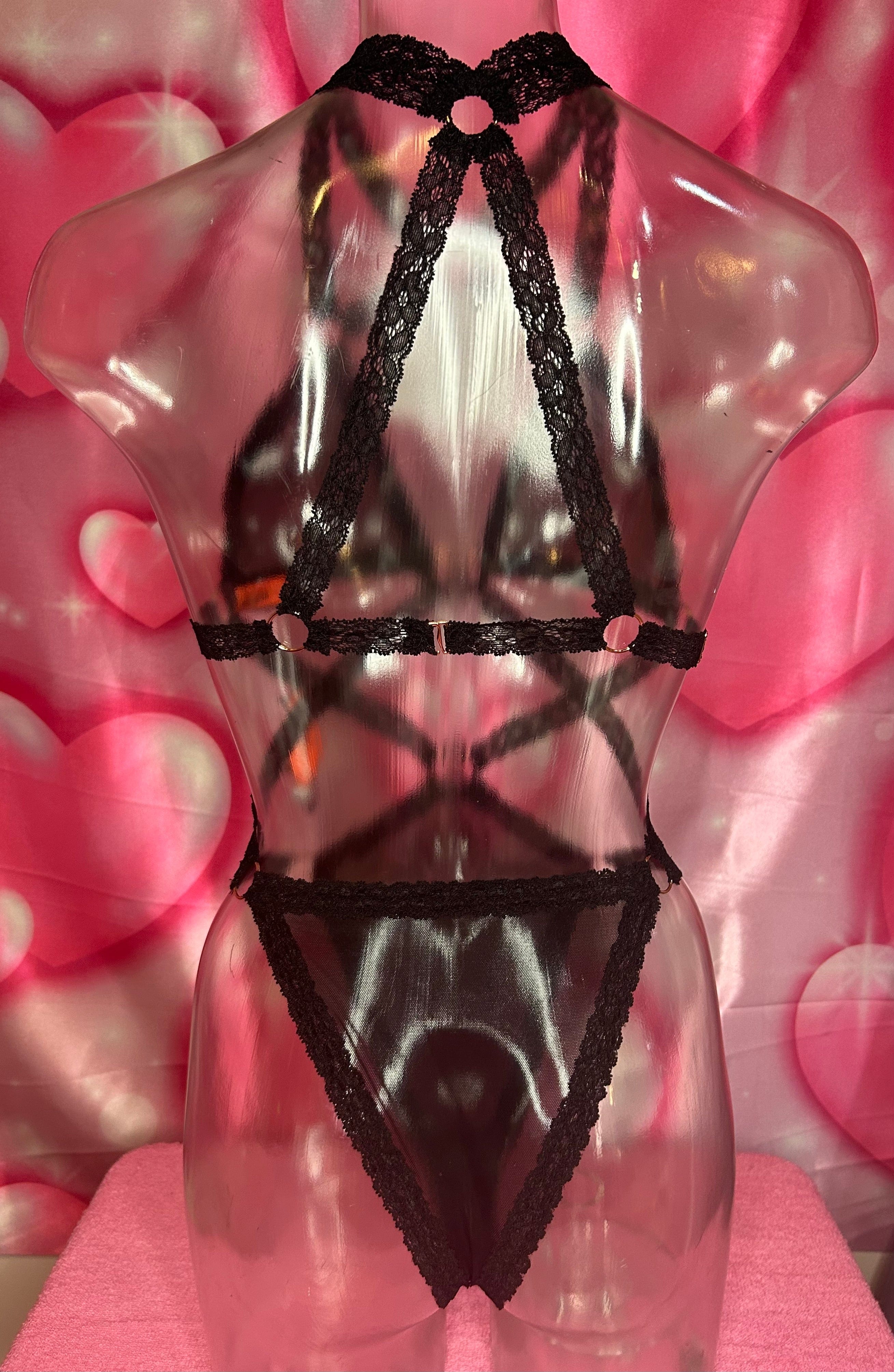 There’s no mistaking it – this one-piece mesh/ lace playsuit puts everything out there! Neon pink lace trim straps criss cross the body highlighting your bodies curves. The rose gold hardware holds this look together with a luxe touch that’s sure to provoke even the tamest of admirers.